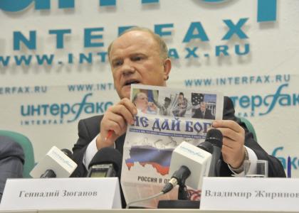 Команда Путина решила удержаться у власти любой ценой, поэтому использует грязные избирательные технологии. В качестве примера лидер КПРФ продемонстрировал журналистам газету «Не дай Бог!», полную «чернухи» в отношении Зюганова, Миронова и Жириновского. Геннадий Андреевич напомнил, что такую же газету против него выпускали во время президентских выборов в 1996 году.