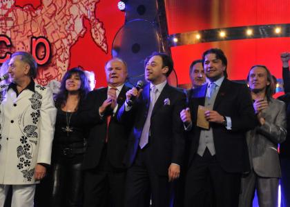 В завершение концерта на сцену поднялись все артисты и почетные гости: Г.А. Зюганов, его ближайшие соратники по КПРФ, а также руководители братских компартий, входящих в СКП – КПСС.