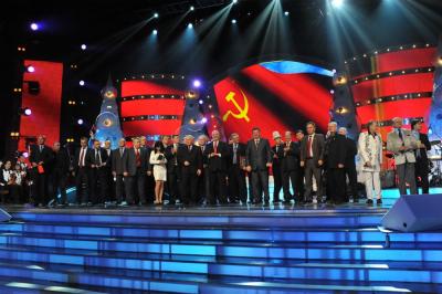 В завершение концерта на сцену поднялись все артисты и почетные гости: Г.А. Зюганов, его ближайшие соратники по КПРФ, а также руководители братских компартий, входящих в СКП – КПСС.