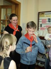 Зато красиво и правильно завязать себе пионерский галстук смогли все, как старшеклассники, так и дошколята. Вот освоить, как правильно держать палочки, когда отбиваешь барабанную «дробь», без помощи старших ребятам не удавалось, однако, это нисколько не повлияло на количество желающих почувствовать себя настоящим барабанщиком отряда. В то время, как детвора изучала премудрости обращения с атрибутикой пионерской жизни, библиотекарь рассказывала, что символизировал пионерский галстук, как принимали в пионерскую организацию и показывала детворе фотографии с их «сверстниками» из прошлого.