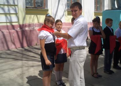 Также пионеров поздравила руководитель Ворошиловской комсомольской организации района Евгения Говорова. Под звуки пионерских маршей гости повязали школьникам галстуки. И вот над праздничной линейкой уже звучит пионерский клич «Будь готов!» и хор звонких детских голосов отвечает ему «Всегда Готов»! Руки школьников взмывают вверх в их первом в жизни пионерском салюте.