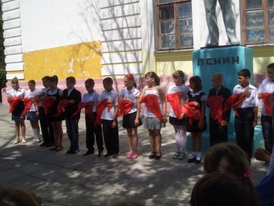 Также пионеров поздравила руководитель Ворошиловской комсомольской организации района Евгения Говорова. Под звуки пионерских маршей гости повязали школьникам галстуки. И вот над праздничной линейкой уже звучит пионерский клич «Будь готов!» и хор звонких детских голосов отвечает ему «Всегда Готов»! Руки школьников взмывают вверх в их первом в жизни пионерском салюте.