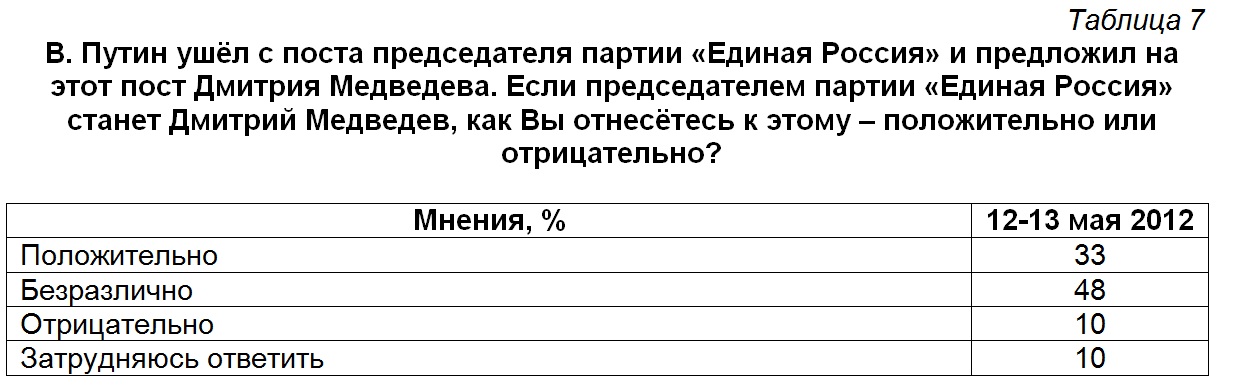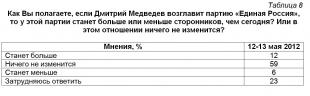 Новая конфигурация власти, предполагающая лидерство Д. Медведева в «Единой России», стала предметом исследования Фонда «Общественное мнение» (http://bd.fom.ru/pdf/d19mkppper12.pdf, опрос «ФОМнибус» 12—13 мая, 100 населенных пунктов, 43 субъекта РФ, 1500 респондентов, статистическая погрешность - 2,3%).