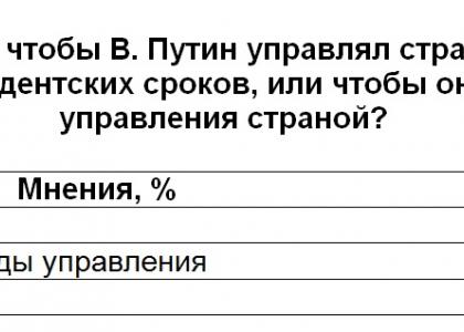 Несколько исследований, проведенных «Левада-Центром» (http://www.levada.ru/15-05-2012/rossiyane-o-politicheskikh-vzglyadakh-svoikh-i-v-putina, опрос 20-23 апреля2012 г. по репрезентативной всероссийской выборке городского и сельского населения среди 1601 человека в возрасте 18 лет и старше в 130 населенных пунктах 45 регионов страны, статистическая погрешность не превышает 3,4%), зондируют мнения респондентов на предмет их оценки взглядов В. Путина, своих собственных и представлений относительно перспектив страны на ближайшее шестилетие.