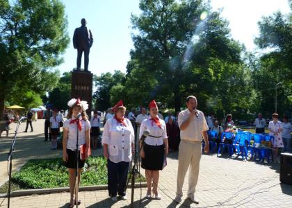 С ответным словом выступили юные пионеры. Завершилась торжественная линейка возложением цветов к памятнику В.И.Ленину и памятной фотографией.