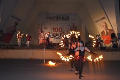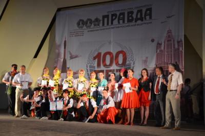Вечер продолжился праздничным концертом, в котором профессиональные и самодеятельные артисты двух государств подарили зрителям русские и украинские песни, народные и современные танцы. Выступления исполнителей из Украины Марии Мовчан и Анастасии Сахно чередовались поздравлениями и добрыми словами в адрес коллектива газеты «Правда». Зрителям представили хронику истории коммунистической газеты и советского государства. Запомнились участникам праздника вокальная группа трио «Маргарита» и обладатель удивительного голоса, преподаватель, кандидат технических наук Донского государственного технического университета, Алексей Авилов. Приняли участие в концерте исполнительница танцев Юлия Щукина и ансамбль танца «Молодость Донетчины». Горячие аплодисменты заслужили детские танцевальные коллективы — эстрадный ансамбль «Двойной форсаж» и детская группа «Афродита». Завершился праздник выступлением молодежной рок-группы и фаер-шоу «Инглия», участницы которого устроили настоящее огненное представление и фейерверк в честь векового юбилея «Правды».