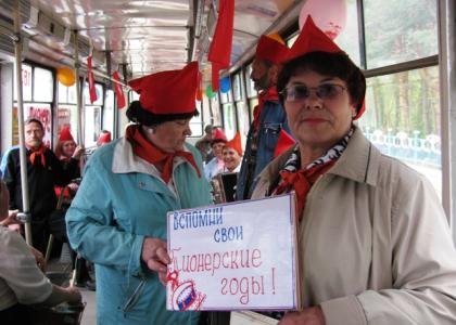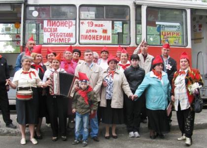 Все лучшее, что было, помнить надо с достоинством, чтоб сердцем не стареть! Под таким девизом активисты ВЖС Надежда России г Бийска: Коробова В.Ф, Лобова М.А. Крапчатова Н.И, а так же женский совет п.Молодежного : Гаврилова Е, Пашкова ВВ и другие уже второй год пускают по городу в честь дня рождении Пионерской организации им.В.И.Ленина - "Пионерский трамвай".
