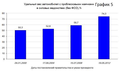 Зато еще более подросла и так колоссальная доля «мигалок» в распоряжении силовиков (ФСБ, МВД, Минобороны, СВР, ФСКН, Генпрокуратуры, Следственного комитета). Их удельный вес в общем числе автомобилей с проблесковыми маячками вырос с половины до трех четвертей (74,3%).