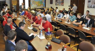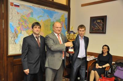 Г.А. Зюганов рассказал молодым спортсменам, что он сам с молодых лет активно занимается спортом. В школьные годы он был чемпионом района по 5 видам спорта, показывал высокие результаты на соревнованиях во время учебы в вузе и во время службы в Армии. Лидеру КПРФ торжественно вручили кубок чемпионата Москвы по мини-футболу, который завоевала наша команда.