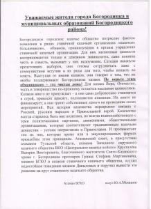 И уже после выборов в Богородицке по городу распространяется полная лживых клеветнических утверждений листовка за подписью некоего есаула с говорящей фамилией Мошкин. «Вся история казачества неразрывно связана с Россией, русским народом и Православной верой», - пафосно пишет Мошкин. А что, разве современные российские коммунисты не отождествляют себя с Россией и русским народом? Русскому вопросу был даже посвящён специальный пленум ЦК КПРФ.