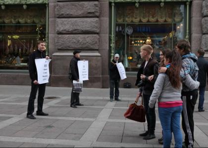 На Малой Садовой улице, в самом центре Петербурга, комсомольцы развернули плакаты «В ЕГО стране зарплата медсестры 1000$», «В ЕГО стране новобрачным на квартиру 20000$», «В ЕГО стране образование и медицина – 0$» и т.д. Эти плакаты привлекли внимание горожан, в особенности молодых петербуржцев. Они хотели узнать, что же это за страна и кто же это «ОН». Но только пройдя и прочитав все плакаты, заинтересовавшиеся могли получить ответ в виде большого портрета полковника Муаммара Каддафи.