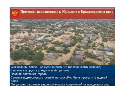Рассматривая экологические проблемы, нельзя обойти молчанием последние трагические события, повлекшие гибель людей. Это - Крымск, Дагестан. Перед этим - саяно-шушенская трагедия. Большинство этих трагедий связано с состоянием гидротехнических сооружений.