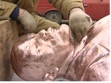 За восстановление памятника взялась группа энтузиастов. Дали объявление в газете, открыли горячую линию по сбору средств. Подходящую скульптуру искали по всей области, а в итоге нашли в самом Ростове на территории химбазы - бывшей воинской части. Скульптура оказалась уникальной:"Здесь выполнено методом чеканки. Он из нескольких половин, потом медью пропаен", - пояснил секретарь районной организации КПРФ Михаил Боков.