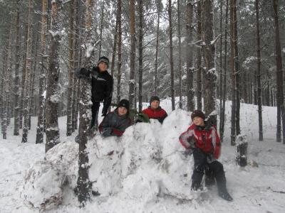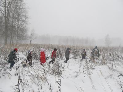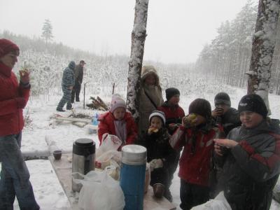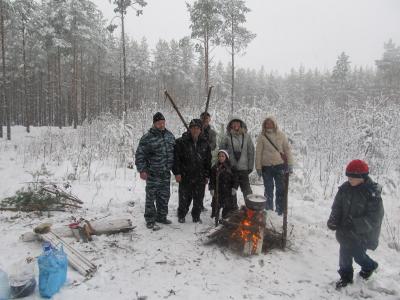 Открыл «неделю добра» турпоход. В этот день как раз выпал первый снег. Проводники по заснеженным полям и лесам, а также работники у костра – шестеро коммунистов. Детей – семеро, причём только один «свой». Маленькие «сусанины» стойко выдержали трудности пешего перехода, помогали разжигать костёр и строили снежные крепости.