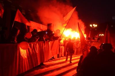 В 17-00 колонна начала движение по аллее Красного проспекта. В исполнении духового оркестра звучали революционные марши и, несмотря на холодную сибирскую погоду и пронизывающий ветер, у тысяч демонстрантов было праздничное настроение. Во главе колонны молодые коммунисты несли пятиметровое знамя СССР.