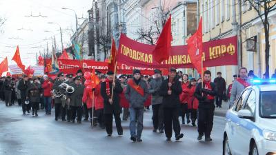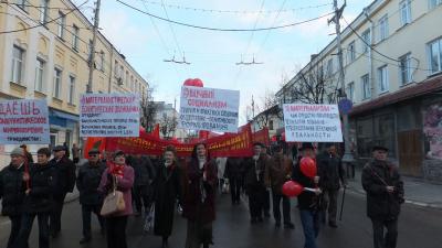 На праздничную демонстрацию коммунисты вышли с лозунгами: «За власть советов!», «Дело Ленина будет жить!», «Коммунисты за социализм!», «Вернуть лучшее в мире советское образование!», «Платная школа – позор России!», «Вернуть льготы пенсионерам!», «Возродить родные заводы!», «Вернуть социальные гарантии военным!», «Прокурор открой глаза – нарушаются права»…