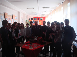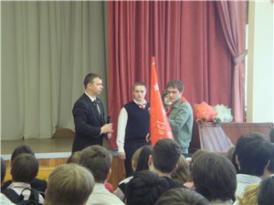 Не состоялась бы встреча без помощи специалиста Красного Креста Михаила Степанова, призвавшего школьников активно заниматься общественной работой. И в завершение встречи Анатолий Туренко вручил школе копию Знамени Победы.