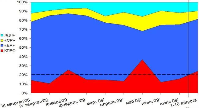 Динамика суммарного партийного эфира, 28 апреля 2008 г. – 10 августа 2009 г.