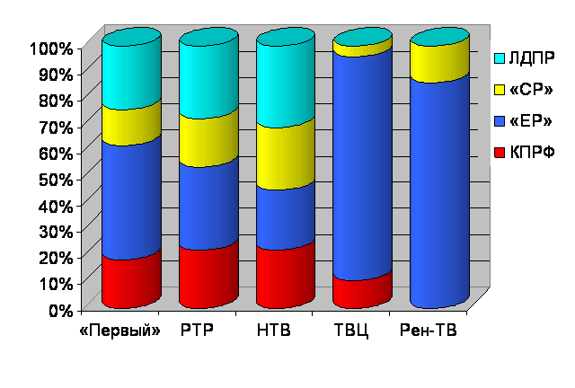 «Единой России» была предоставлена наибольшая доля телеэфира на Рен-ТВ и ТВЦ (92 и 55%). Однако нигде эта величина не опускалась ниже 26%. «Справедливая Россия» заняла максимум эфира телеканала НТВ (26%). ЛДПР отдали предпочтение «Россиия» и НТВ (25 и 23%).