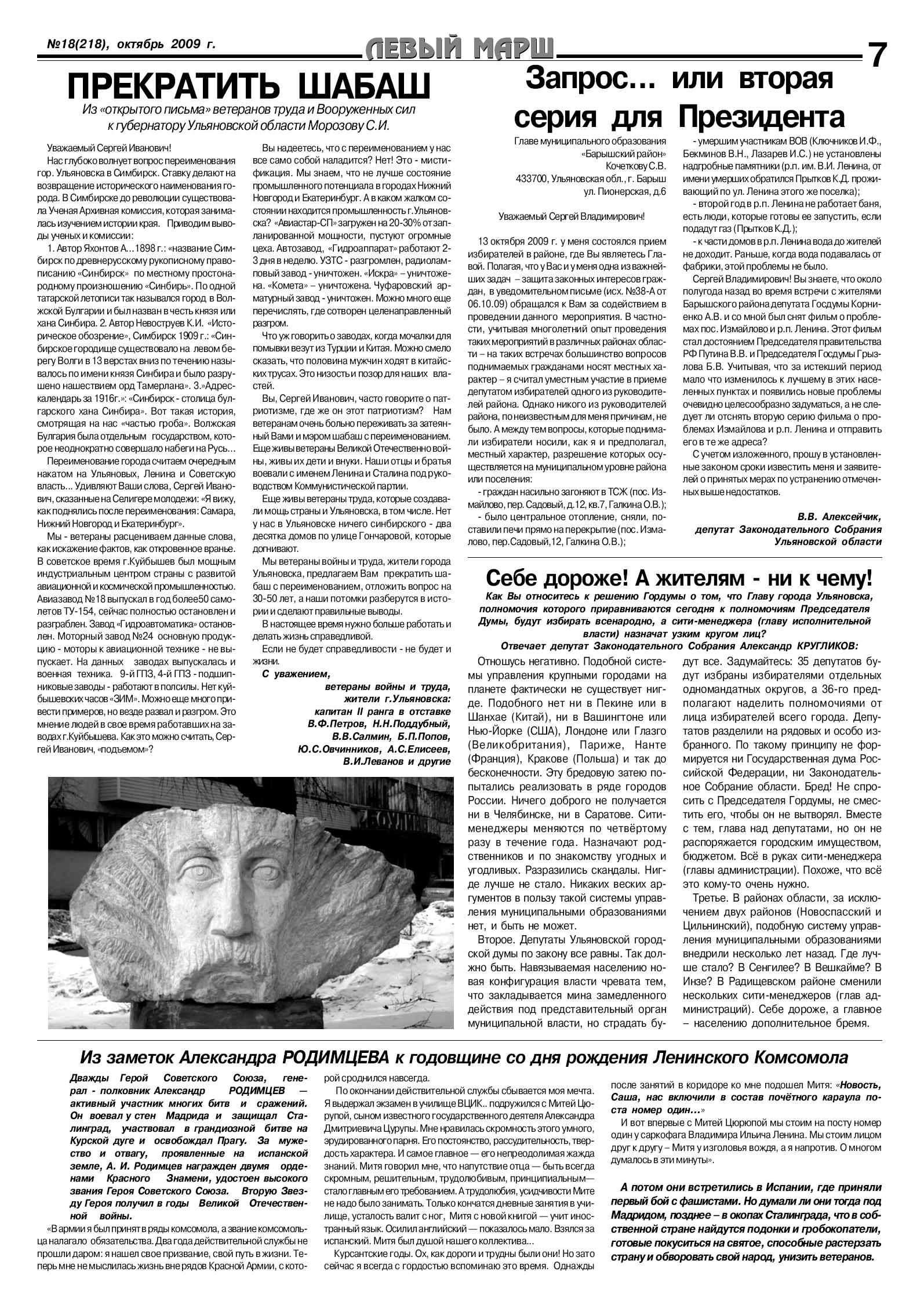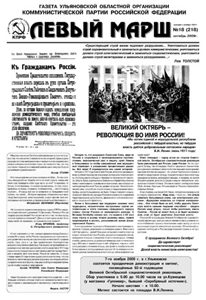 Вышел в свет очередной, 18-й номер газеты ульяновских коммунистов «Левый марш». Он открывается материалами, посвященными приближающейся 92-й годовщине Великой Октябрьской социалистической революции. Отмечая эту годовщину, прогрессивное человечество в условиях нового глобального кризиса капитализма видит выход из него в реализации социалистической альтернативы, подчеркивает газета. Обновленный социализм необходим и России ради спасения страны и ее процветания.