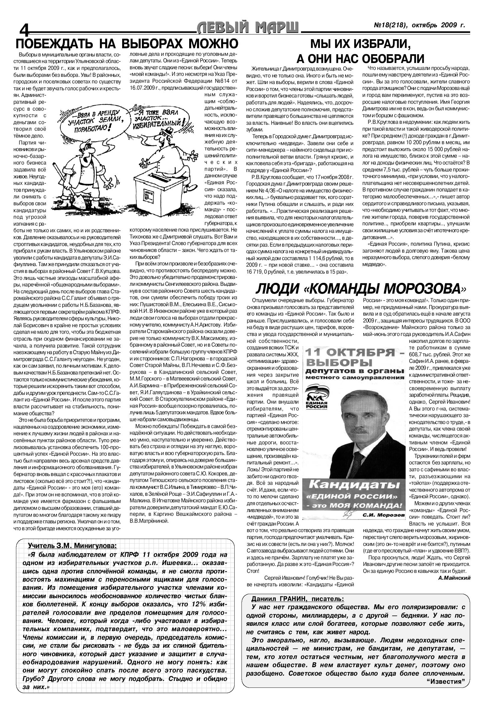 В газете подробно освещаются результаты выборов 11 октября. На территории Ульяновской области, как и предполагалось, они были выборами без выбора. В районных, городских и поселковых советах по существу так и не будет звучать голос рабочих и крестьян. Административный ресурс в совокупности с деньгами сотворил свое темное дело. В районах и населенных пунктах тупо реализовывалась установка обеспечить 100-процентный успех «Единой России». Однако коммунистам побеждать можно, делает вывод газета, рассказывая об их успехах на выборах в ряде районов. Но действовать необходимо умно, наступательно и уверенно.