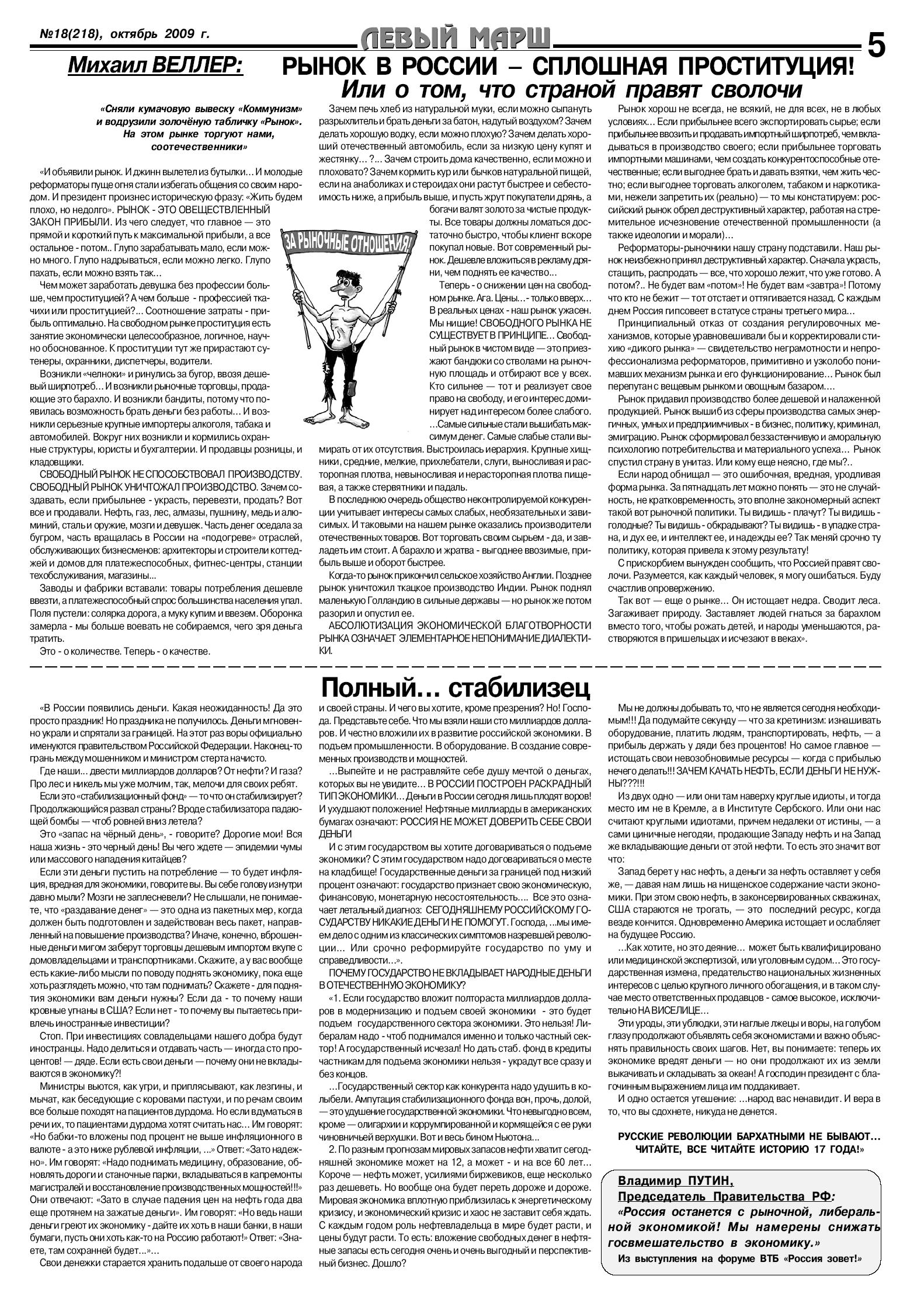 Красноречивый заголовок зовет читателя к заметкам Михаила Веллера: «Рынок в России – сплошная проституция! Или о том, что страной правят сволочи».
