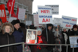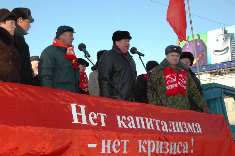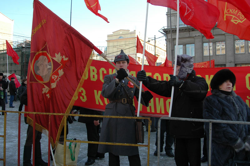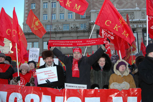 Около трёх тысяч сторонников КПРФ собрались в субботу на Триумфальной площади в Москве на митинг в защиту прав трудящихся и против повышения цен и тарифов на услуги ЖКХ, против бездарной антикризисной политики правительства Путина и "Единой России".Протестующие, которые пришли на площадь несмотря на сильный мороз, держат в руках красные флаги и транспаранты с лозунгами: "Нет коммунальному грабежу", "Политика роста цен ведет к социальному взрыву", "Нет росту цен на продукты питания" и т.д. Участники акции протеста скандировали требования отставки правительства Путина, в поддержку антикризисной программы КПРФ.