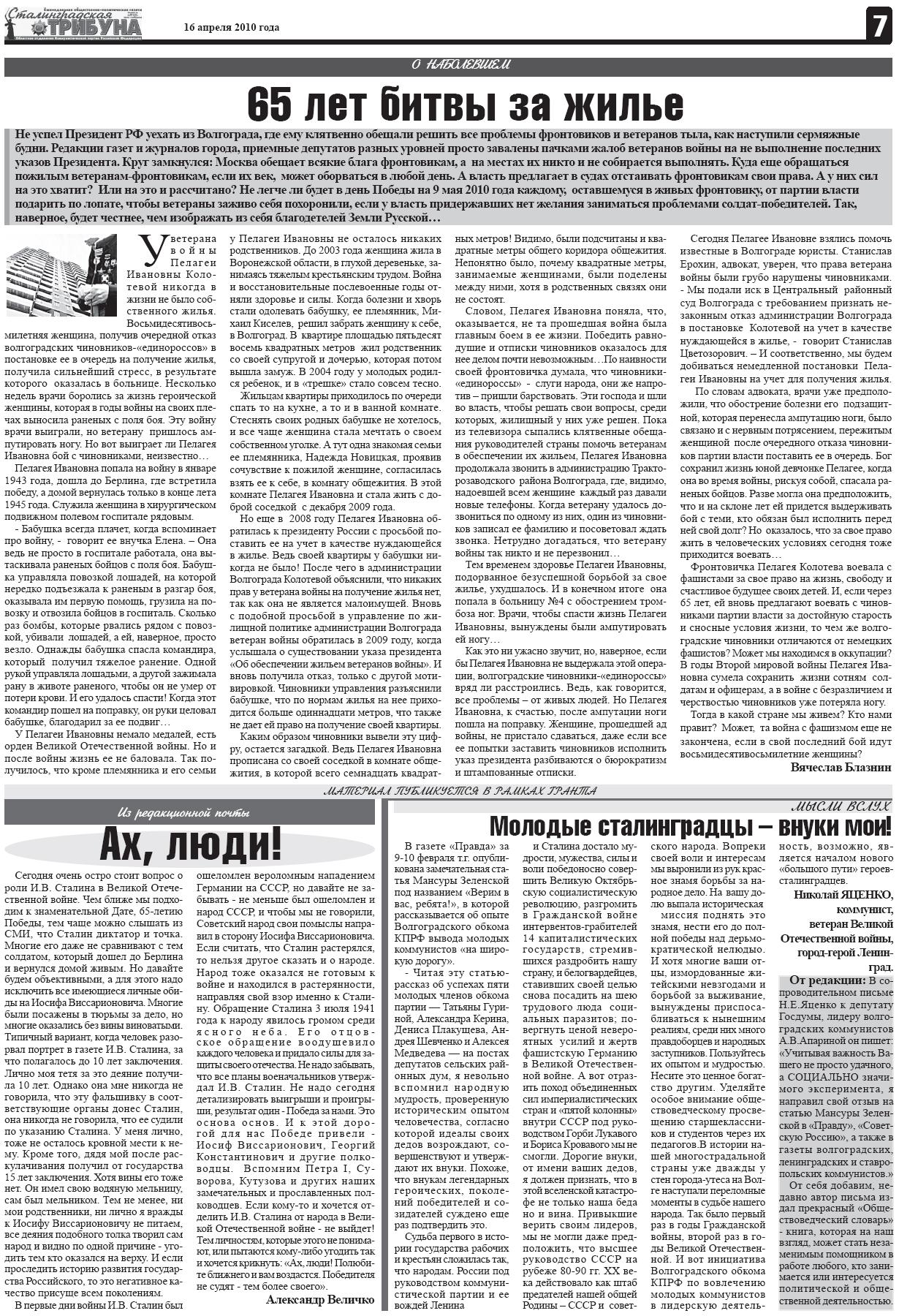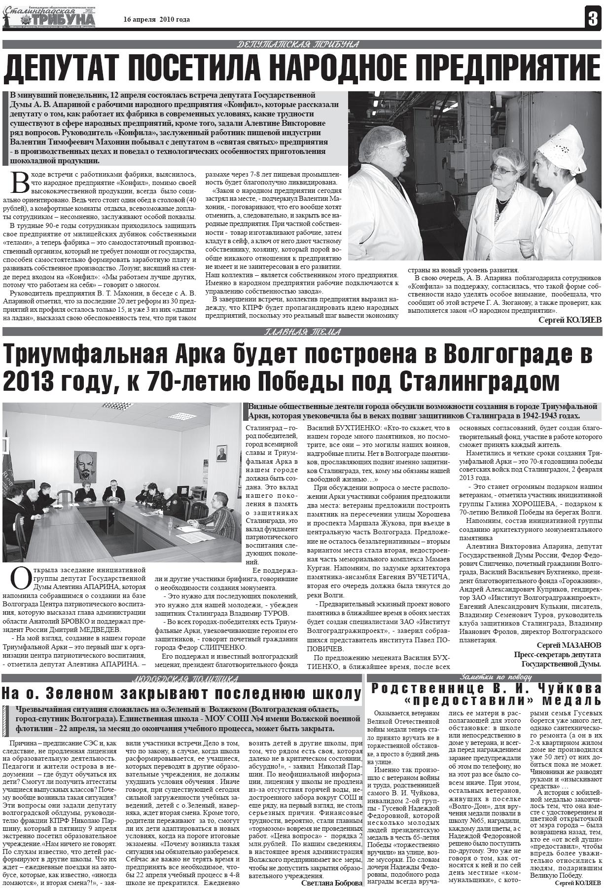 На третьей полосе газеты вас заинтересует информация о встрече депутата Государственной Думе А. В. Апариной с трудовым коллективом народного предприятия «Конфил», а видные общественные деятели города расскажут о возможности создания в Волгограде к 2013 году триумфальной арки, посвященной памяти защитников Сталинграда в 1942-1943 годах.