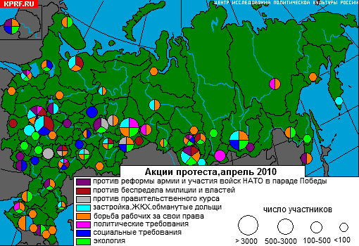 В апреле 2010 года впервые с начала года наблюдался спад протестной активности. Всего за месяц было зафиксировано 209 митингов, пикетов, шествий и прочих акций проявления гражданского протеста. Это немного меньше (на 25 акций) мартовских показателей (в данный мониторинг не включены акции, посвящённые 140-летию со Дня рождения В.И.Ленина).