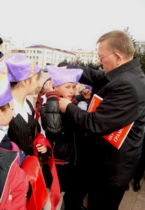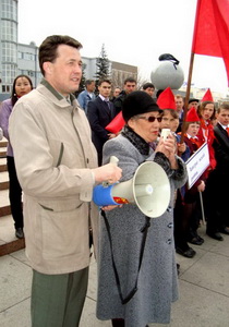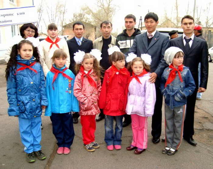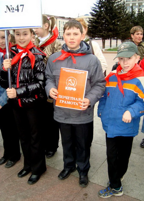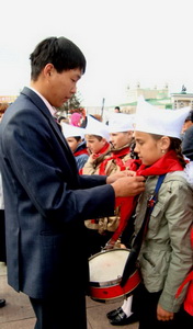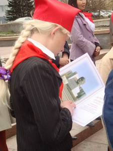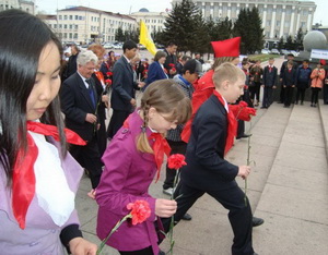 Продолжила приятную процедуру церемония поздравления ребят, принимавших активное участие в деле возрождения пионерского движения в Республике Бурятии. Что не говорита а приятно было палучить почётную грамоту из рук первого секретаря рескома КПРФ. Закончилась торжественная линейка возложением цветов к памятнику В.И. Ленину.