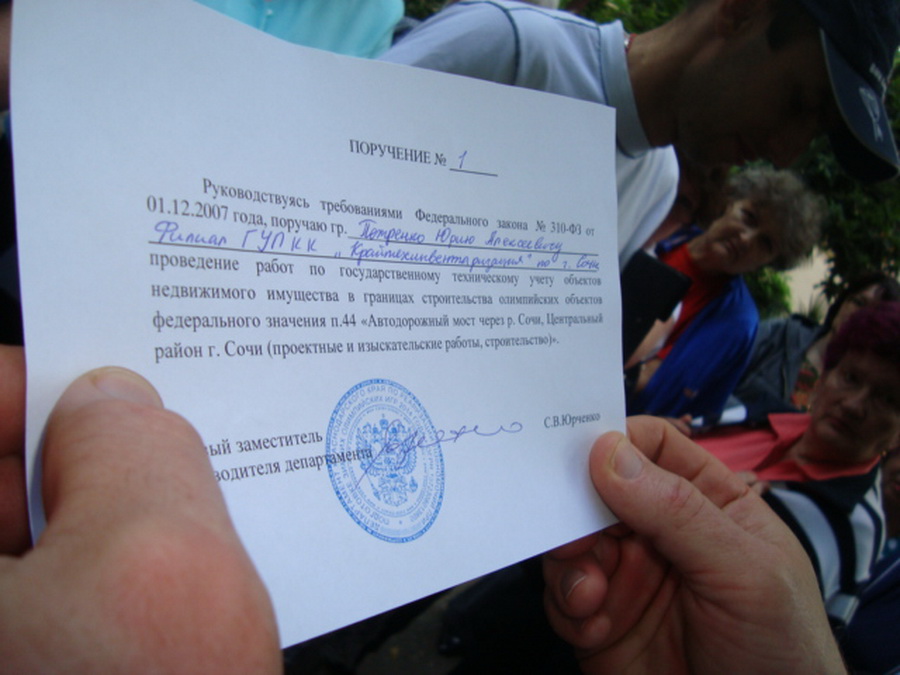 По Конституции РФ такое право может возникнуть только по решению суда в установленных законом случаях. Однако, в депеше, которую предъявили жителям визитеры было сказано следующее: «Поручение № 1. Руководствуясь требованием ФЗ № 310 поручаю… филиал ГУП КК «Крайтехинвентаризация» по городу Сочи проведение работ по государственному техническому учету объектов недвижимого имущества в границах строительства Олимпийских объектов федерального значения п.44 «Автодорожный мост через реку Сочи (проектные и изыскательные работы, строительство). Заместитель департамента края –С.З. Юрченко».