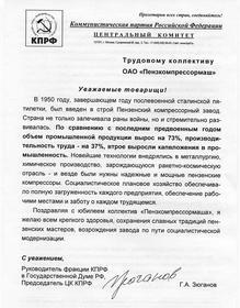 1 июля 2010 г. исполнилось 60 лет со дня основания «Пензенского завода компрессорного машиностроения» (с 1992 г. ОАО «Пензкомпрессормаш»). В этот день лидер КПРФ Г.А. Зюганов направил трудовому коллективу ОАО «Пензкомпрессормаш» поздравительное письмо.
