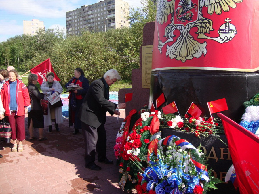 Склонились головы собравшихся на пикет-митинг, склонились красные знамена… К подножию памятника подводникам легли цветы и венок от коммунистов Мурмана. Вечная память погибшим на АПЛ «Курск»!