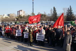 Митинг открыл первый секретарь Красноярского городского комитета КПРФ В. С. БЕДАРЕВ.