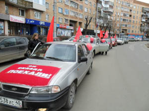 Автоколонна из шести автомобилей, украшенных красными знамёнами, партийной символикой и лозунгами: «Дорогу к звездам прокладывали коммунисты», «Калуга – колыбель космонавтики», «Москва – Луна, Калуга – Марс», «Он сказал – поехали!» под советские песни проследовала по центральным улицам города..