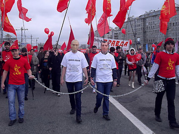 Главными лозунгами КПРФовцев стали «России – новый курс и новое правительство», «Кудрина, Сердюкова, Фурсенко – в отставку», «Собственность олигархов – на службу народу». Молодежь вела под конвоем закованных в наручники активистов в масках Путина и Медведева.