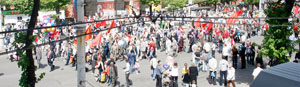 Затем краснознамённая колонна двинулась по проспекту Революции. "Слава Красной Армии!" "Слава товарищу Сталину!" "Слава Коммунистической партии!", «Да здравствуют ветераны Великой Отечественной войны!» «Слава советскому народу-победителю!» - звучало из колонны. Множество воронежцев, заполнявших проспект, самодеятельные и профессиональные артисты, выступавшие на сценических площадках, в подавляющем большинстве своем встречали шествие коммунистов улыбками и словами приветствия, фотографировали происходящее. Приятно отметить, что в руках у праздновавших Победу молодых людей в большинстве своём были не российские (а с точки зрения истории Великой Отечественной войны - власовские) «триколоры», а пластиковые флажки – мини-копии Знамени Победы и другая советская символика, тяга к которой у молодых растёт, вопреки всем ухищрениям буржуазной власти. А значит, идеалы Победы обязательно восторжествуют вновь.