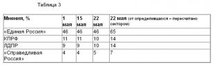 Таким образом, партия власти, как оказалось, возможно, неожиданно для себя самой получила некоторую возможность, паразитируя на ценностях левой политической субкультуры, играть на левом поле. Скорее всего, эффект, достигнутый властью, скоротечен и преходящ, он получен за счет мобилизации мощного административно-медийного ресурса, но этот симптом не может не вызывать известной тревоги. Правда, это относится к разряду непосредственных результатов, полученных более от декларирования идеи народного фронта, к тому же имеющей мощное медийное сопровождение, чем от ее реализации. И это же пока не сказалось на конфигурации электоральных намерений – готовности голосовать на думских выборах за ту или иную партию, – запас инерционности которых гораздо выше (табл. 3). Во всяком случае, на протяжении мая соотношение сил между партиями пребывало практически в неизменности и никакие фронтистские поползновения не смогли на него каким-либо образом повлиять.