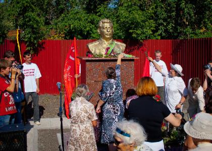 Почетное право открыть памятник предоставили генерал-лейтенанту, участнику Великой Отечественной войны и двух парадов Победы В.И. Зайцеву, и первому секретарю обкома КПРФ Г.П. Камневу. Под звуки фанфар они спустили белое покрывало с бюста И.В. Сталина. Участники митинга возложили к подножию памятника цветы. В это время играла патриотическая песня Ивана Баранова «Часы истории идут». «…Проходят дни, подходят сроки, / Часы Истории идут – / Вождю достойные потомки, / Как надо почесть воздадут», - доносилось из динамиков.