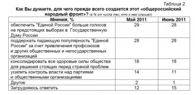 Это следует, например, из данных опроса общественного мнения, проведенного в 15-19 июля «Левада-Центром» (http://www.levada.ru/press/2011072700.html). Респонденты вовсе не склонны идеализировать те цели, ради которых, на их взгляд, фронт был создан, считая их в большинстве своем не слишком и праведными (табл. 2). Из числа тех, кто проявляет ту или иную степень осведомленности о фронте (таковых набирается чуть более половины из числа опрошенных), только примерно каждый пятый (18%) допускает, что его создание продиктовано благой целью консолидации всех здоровых сил общества. Более популярны на данный счет соображения негативного характера. Так, фронтистское объединение рассматривается как способ «Единой России» поправить собственные изрядно пошатнувшиеся дела, обеспечив себе приток дополнительных голосов на выборах (56%) либо усилить контроль власти над партиями и общественными организациями (11%).