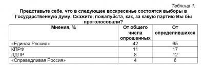 Согласно полученным результатам (табл. 1), КПРФ сохраняет свое положение второй по своему электоральному влиянию партии и располагает поддержкой 17% избирателей. Из других оппозиционных партий, разрыв между которыми и КПРФ несколько увеличился, 12% составит показатель электоральной поддержки ЛДПР. «Справедливая Россия» уже привычным образом не дотягивает до 7%-го барьера, хотя и вплотную к нему приближается, набирая 6% голосов.