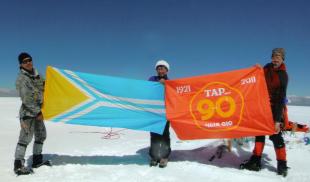 Это уже второй транспарант команды «7 вершин мира – Тува», водруженный на вершину. В первый раз они водрузили подобный транспарант 23 февраля 2011 года на высочайшей вершине Австралии – г.Косцюшко.