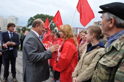 На митинге выступил ветеран партии и комсомола В.С. Афонин. Он отметил, что с большим удовольствием выслушал выступление лидера КПРФ. «Это слова настоящего русского человека. Нынешние правители с нами таким языком не говорят. Потому что у них вместо языка болтается доллар».