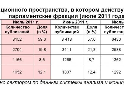 Характер освещения в информационном пространстве парламентских партий и их фракций в Государственной Думе ФС РФ в июле 2011 года