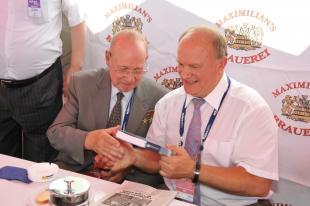 Во время посещения авиасалона Г.А. Зюганов вручил памятную медаль ЦК КПРФ «50 лет космонавтике» Заслуженному летчику-испытателю РФ, Герою России М.О. Толбоеву.