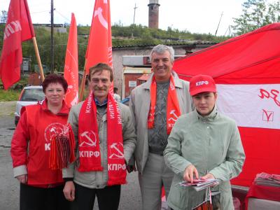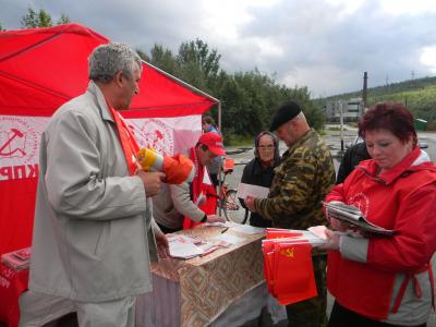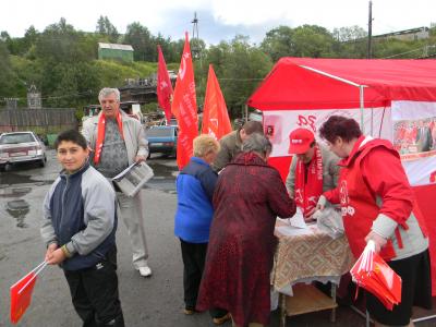 Геннадий Степахно, Ирма Зива, Сергей Артемьев и Екатерина Осиева установили в центре поселка яркую палатку, красные флаги КПРФ и Победы и организовали сбор подписей и бюллетеней в поддержку КПРФ, в том числе и на предстоящих выборах.