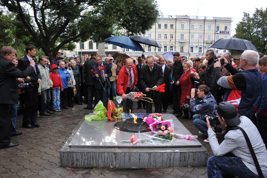 Вечером 25 августа Председатель ЦК КПРФ Г.А. Зюганов принял участие в многотысячном митинге, состоявшемся на площади Ленина в Омске.