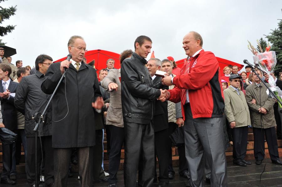 Перед началом акции Г.А. Зюганов вручил партийные билеты вновь принятым в ряды КПРФ товарищам и награды коммунистам, отличившимся при сборе подписей по вопросам Народного референдума.