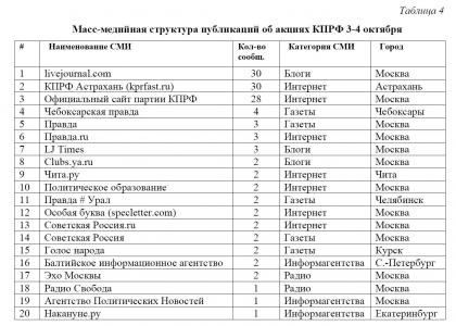 Масс-медийная структура публикаций об акциях КПРФ 3-4 октября представлена в таблице 4.
