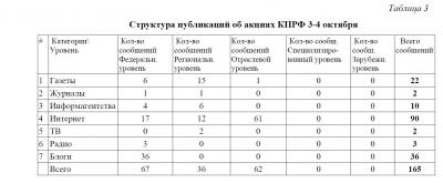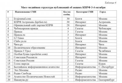 Масс-медийная структура публикаций об акциях КПРФ 3-4 октября представлена в таблице 4.